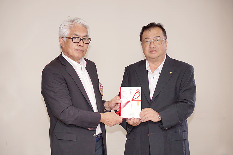 当トーナメントの菊田浩之会長は9月13日(水)、後援をいただいている東北ゴルフ連盟の主催競技「東北倶楽部対抗競技」開催中の十和田国際チサンカントリークラブを訪れ、金原寿一事務局長に、また、9月8日(金)、宮城県ゴルフ連盟事務局にて鈴木勝彦事務局長に義援金10万円を寄贈しました。金原事務局長は「震災後、長きに渡って貴重なチャリティー基金を寄贈いただき大変感謝申し上げます。この寄付金は有効に利用させていただきます。宮城オープントーナメント様の今後の発展を願っています」と感謝の言葉を述べられました。